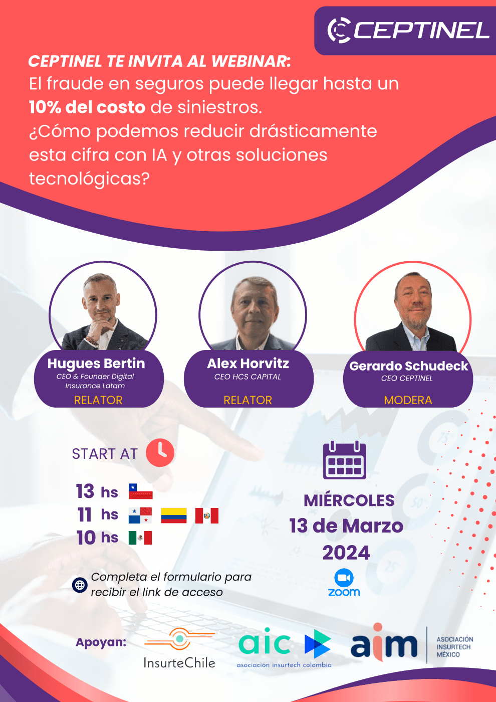 El webinar contará con las exposiciones de los líderes nacionales e internacionales Hugues Bertin, CEO & Founder de Digital Insurance LatAm, y Alex Horvitz, CEO de HCS Capital como relatores; y la moderación de Gerardo Schudeck Díaz , CEO de Ceptinel .